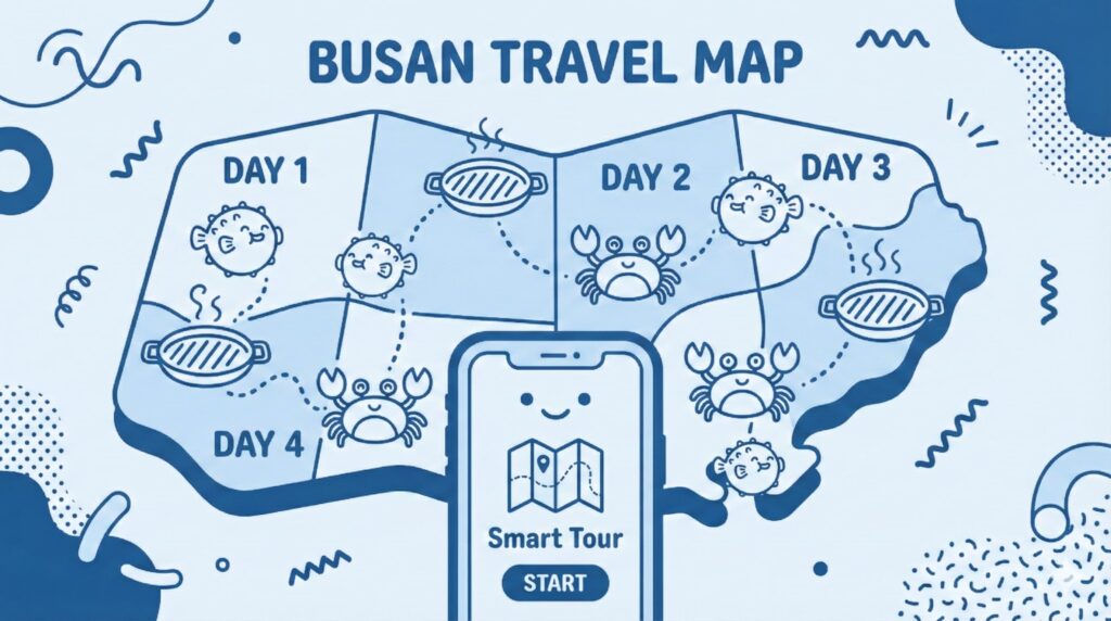 - Zone A (민락·광안리): 숙소 베이스. 야경과 세련된 해산물 요리 중심 (미포집, 게장류).