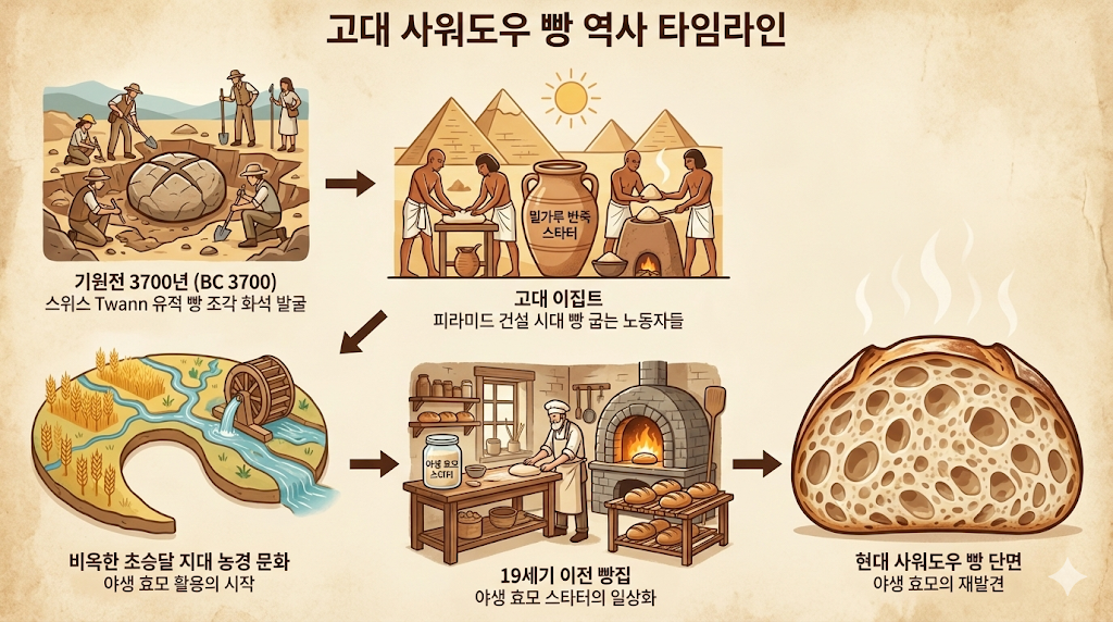 ‘신맛 나는 반죽’이라는 뜻의 사워도우(Sourdough) 는 인류가 미생물을 이용해 음식을 가공한 가장 오래된 생명공학 기술 중 하나입니다. 고고학적 기록에 따르면 기원전 3,700년경 스위스 지역까지 그 뿌리가 거슬러 올라가며, 비옥한 초승달 지대와 고대 이집트 농경 문화에도 그 흔적이 남아 있습니다.