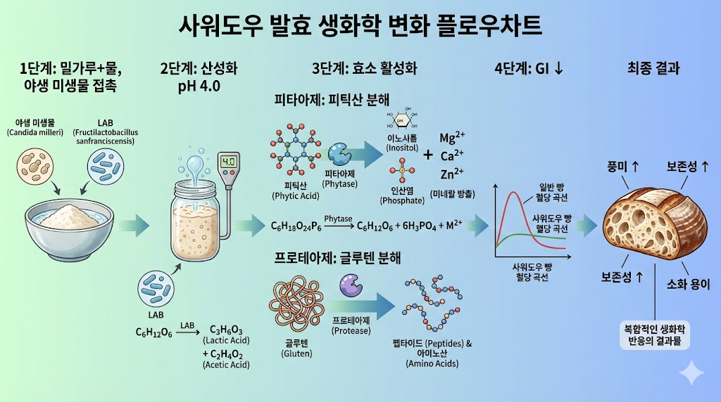 사워도우의 장시간 발효는 단순히 빵을 부풀리는 것에 그치지 않습니다. 반죽의 영양 구조를 근본적으로 변화시키는 세 가지 마법이 일어납니다.